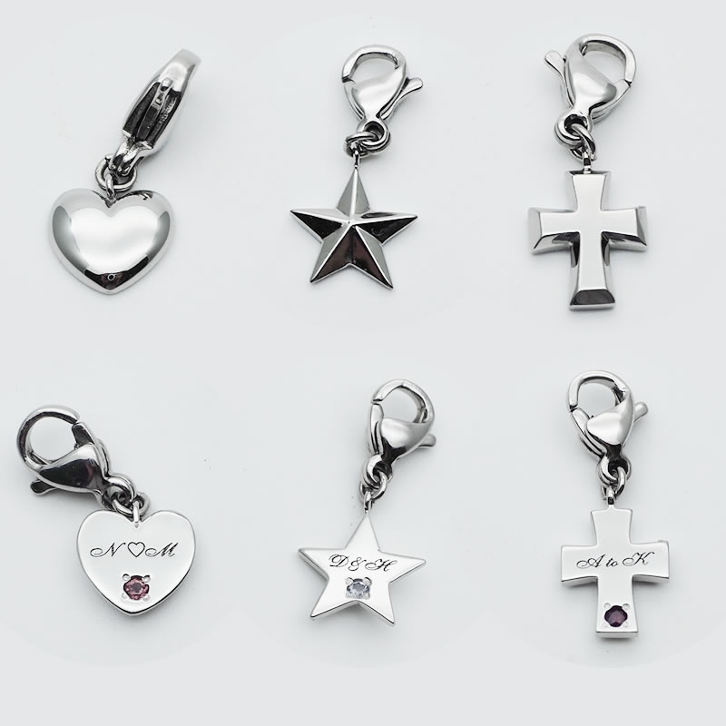 チャームやパーツは全てサージカルステンレス製の為、金属アレルギーにも対応。おふたりのお肌のことも考えました。