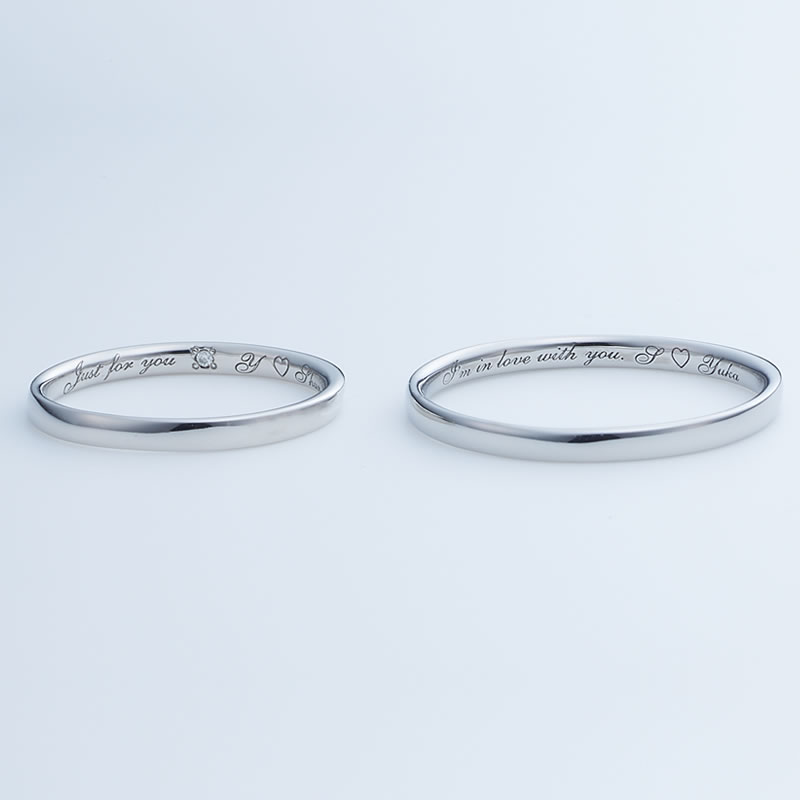 斜めに入るラインのデザインがアクセント。シンプルな中に、光を受けて際立つデザインはスタイリッシュです。女性のみ内側にダイヤを一粒施しました。