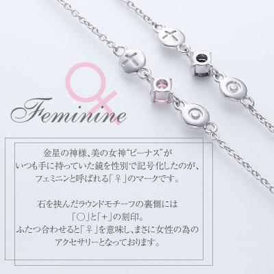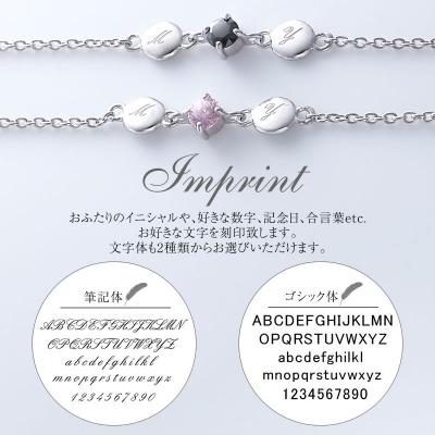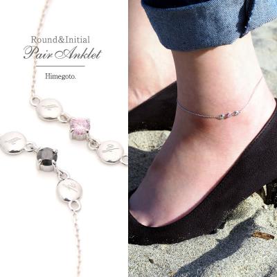 コロンと丸いプレートに、おふたりのお好きな文字を刻めるペアブアンクレット。裏側に彫られた「○」と「+」が意味するのは、女性を表すマークでもある「♀」フェミニンマーク。真ん中に入れられるストーンは、お好きな色をお選びいただけます。女性らしさをアップさせてくれる、細身で華奢なアンクレットです。足首の見えるファッションのアクセントとしてはもちろん、“見せないオシャレ”でこっそりペアにするのもオススメです。
